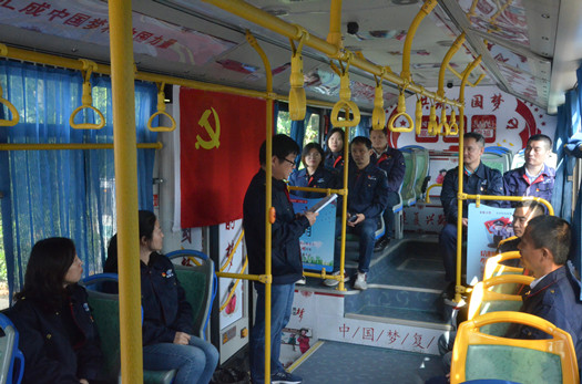 終日奔忙于各條線(xiàn)路的公交駕駛員如何上黨課。10月21日下午,高新公交黨支部把黨課搬到公交車(chē)上,黨員同志在工作一線(xiàn)圍坐一團,小小公交車(chē)成了學(xué)習宣講的大課堂。