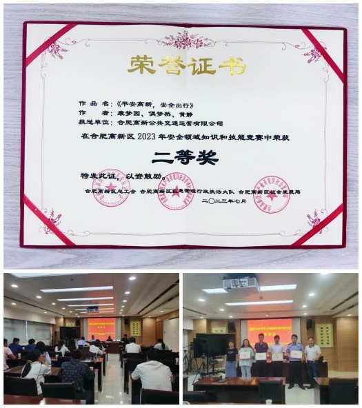 9月28日上午,合肥高新區2023年安全領(lǐng)域勞動(dòng)和技能競賽頒獎儀式在高新區管委會(huì )舉行,高新公交《平安高新 安全出行》參賽視頻榮獲二等獎。