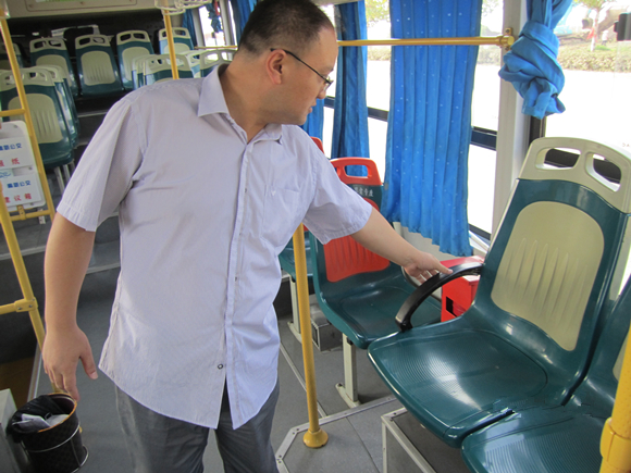 領(lǐng)導在公交車(chē)內檢查車(chē)內衛生情況