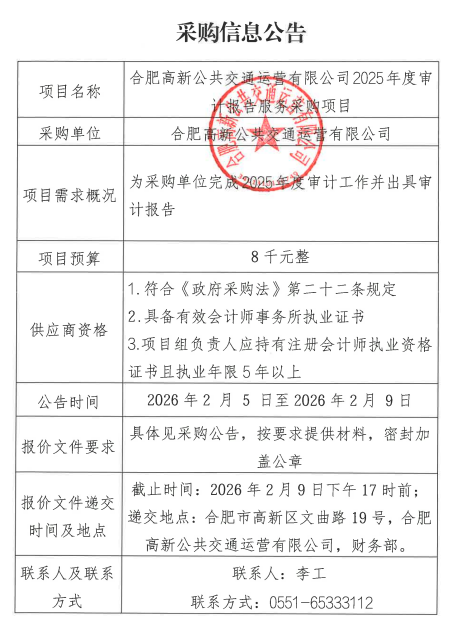 合肥高新公共交通運營(yíng)有限公司2025年度審計報告服務(wù)采購項目公告