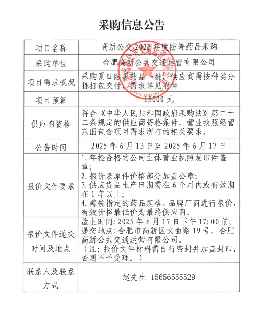 高新公交2025年度防暑藥品采購公告