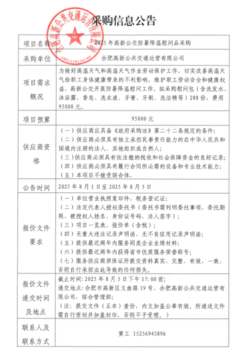 2025年高新公交防暑降溫慰問(wèn)品采購信息公告