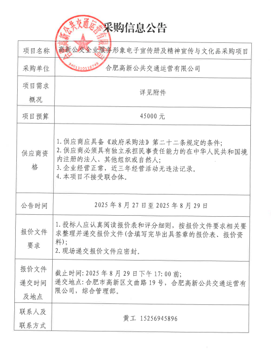 高新公交企業(yè)服務(wù)形象電子宣傳冊及精神宣傳與文化品項目采購信息公告